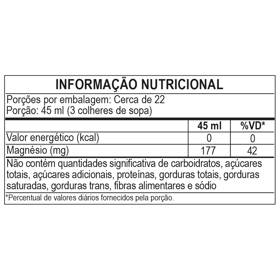 | - Este produto não é um medicamento. - Não exceder a recomendação diária de consumo indicada na embalagem. - Mantenha fora do alcance de crianças. - Gestantes e/ou lactantes somente devem consumir este produto sob orientação de nutricionista ou médico. - Manter a embalagem bem fechada e em local seco e fresco. Não expor à luz solar. Após o preparo do produto, consumir em até 30 dias. NÃO CONTÉM GLÚTEN. | 1. Ecycle. Cloreto de magnésio: o que é e para que serve? Disponível em: <https://www.ecycle.com.br/cloreto-de-magnesio/> 2. Costa, Flávia. Cloreto de magnésio: para que serve e como usar. Disponível em: <https://www.tuasaude.com/cloreto-de-magnesio/> 3. De Oliveira, Ana Paula. 8 benefícios do cloreto de magnésio para a saúde. Disponível em: <https://saude.zelas.com.br/artigos/beneficios-cloreto-de-magnesio> 4. Lapon. Benefícios do magnésio: tudo sobre cloreto de magnésio P.A e magnésio dimalato. Disponível em: <https://lapon.com.br/cloreto-de-magnesio-7-beneficios-para-seu-corpo/> |