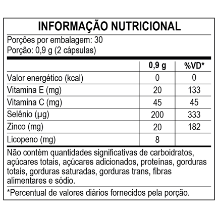 | - Este produto não é um medicamento. - Não exceder a recomendação diária de consumo indicada na embalagem. - Mantenha fora do alcance de crianças. - Este produto não deve ser consumido por gestantes, lactantes e crianças. - Manter a embalagem bem fechada e em local seco e fresco. Não expor à luz solar. Consumir em até 90 dias após aberto. NÃO CONTÉM GLÚTEN. | 1. Da Costa, Paula. R. F; Monteiro, Antonio. R. G. Benefícios dos antioxidantes na alimentação. Disponível em: <https://periodicos.unicesumar.edu.br/index.php/saudpesq/article/view/996> 2. G1. Licpoeno: o antioxidante que ajuda a prevenir câncer e faz bem para o coração. Disponível em: <https://g1.globo.com/bemestar/noticia/2018/12/11/licopeno-o-antioxidante-que-ajuda-a-prevenir-cancer-e-faz-bem-para-o-coracao.ghtml> 3. Ramos, Melanie. O licopeno e sua importância como antioxidante. Disponível em: <https://www.hsnstore.pt/blog/suplementos/antioxidantes/licopeno/> 4. Zanin, Tatiana. Licopeno: o que é, para que serve e em que alimentos encontrar. Disponível em: <https://www.tuasaude.com/licopeno/> |