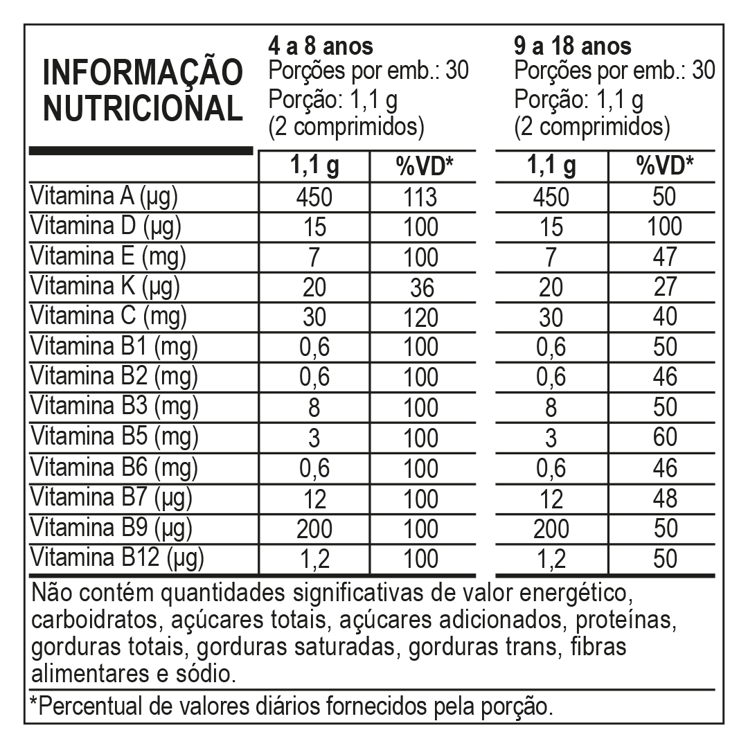 ![]() | ![]() Ingredientes Ácido ascórbico, acetato de DL-alfa-tocoferol, nicotinamida, D-pantotenato de cálcio, acetato de retinol, menaquinona-7, riboflavina, cloridrato de tiamina, cloridrato de piridoxina, ácido fólico, colecalciferol, D-biotina e cianocobalamina. Edulcorante: sorbitol. Agente de massa: celulose microcristalina. Antiumectante: estearato de magnésio. Aroma idêntico ao natural de tutti-frutti. |