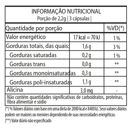 | - Este produto não é um medicamento. - Não exceder a recomendação diária de consumo indicada na embalagem. - Mantenha fora do alcance de crianças. - Este produto não deve ser consumido por gestantes, lactantes e crianças. - Manter a embalagem bem fechada e em local seco e fresco. Não expor à luz solar. Consumir em até 60 dias após aberto. ALÉRGICOS: CONTÉM DERIVADOS DE SOJA. NÃO CONTÉM GLÚTEN. | 1. Rogers, Kristen. 6 benefícios do alho para a saúde e dicas de como consumir. Disponivel em: <https://www.cnnbrasil.com.br/saude/o-que-se-sabe-sobre-os-beneficios-do-alho-a-saude/> 2. Unimed. Benefícios do alho: mais que um tempero, um aliado na saúde. Disponível em: <https://www.unimed.coop.br/viver-bem/alimentacao/beneficios-do-alho-mais-que-tempero-um-aliado-na-saude> 3. Viver melhor. Benefícios do alho. Disponível em: <https://vivermelhordomiciliar.com.br/beneficios-do-alho/> 4. Zanin, Tatiana. Para que serve o óleo de alho em cápsulas (e como tomar). Disponível em: <https://www.tuasaude.com/oleo-de-alho-em-capsulas/> |