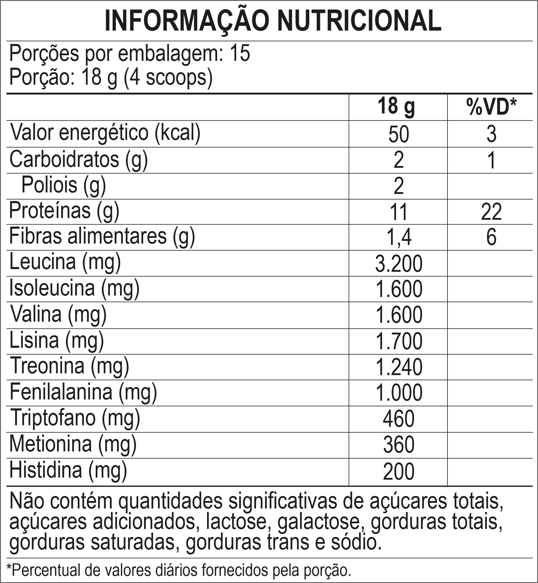 ![]() | ![]() Ingredientes Leucina, cloridrato de lisina, isoleucina, valina, treonina, fenialanina, L-triptofano, metionina, histidina, polidextrose, edulcorante xilitol, aroma natural de limão, acidulante ácido cítrico, edulcorante glicosídeo de esteviol e corante natural urucum. Antiumectante: dióxido de clorofila. |