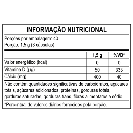 | Este produto não é um medicamento. - Não exceder a recomendação diária de consumo indicada na embalagem. - Mantenha fora do alcance de crianças. - Gestantes e/ou lactantes somente devem consumir este produto sob orientação de nutricionista ou médico. - Manter a embalagem bem fechada e em local seco e fresco. Não expor à luz solar. Consumir em até 60 dias após aberto. NÃO CONTÉM GLÚTEN | 1. Hospital face. A importância do cálcio e da vitamina D para o corpo humano. Disponível em: <https://hospitaldaface.com.br 2. IMEB. Cálcio: 10 benefícios para saúde. Disponível em: <https://imeb.com.br/os-10-beneficios-do-calcio-para-saude/> 3. Laci laboratório. Vitamina D3: conheça os seus benefícios e contraindicações. Disponível em: <https://www.laci.com.br/web/?p=1307> 4. Leal, Karla. Voitamina D3: para que serve, fontes (e quantidade recomendada). Disponível em: <https://www.tuasaude.com/vitamina-d3/> |