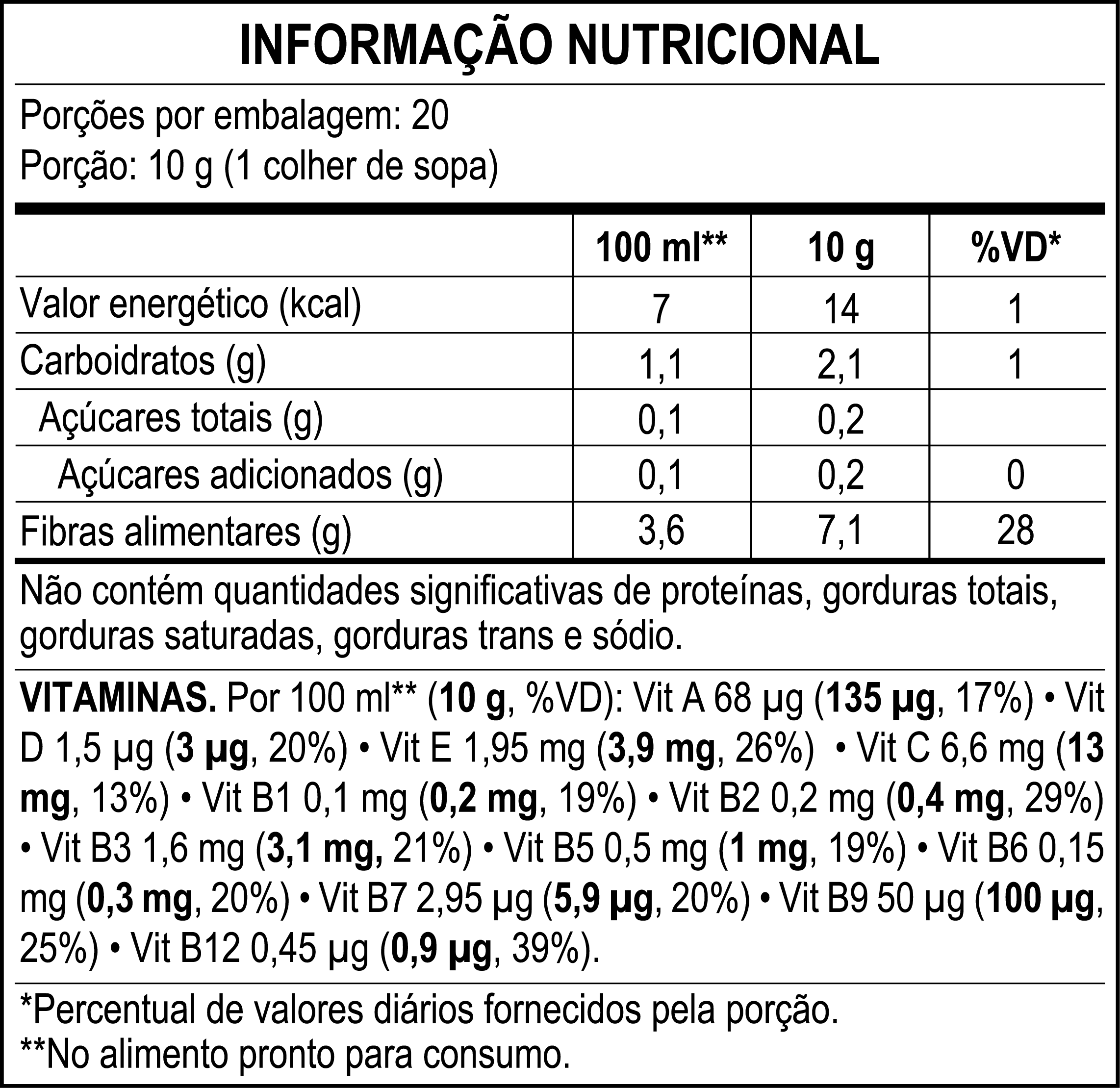![]() | ![]() Ingredientes polidextrose, hibiscus extrato solúvel, beterraba em pó, ácido ascórbico, acetato de DL-alfa-tocoferol, nicotinamida, D-pantotenato de cálcio, acetato de retinol, riboflavina, cloridrato de piridoxina, cloridrato de tiamina, ácido fólico, D-biotina, colecalciferol, cianocobalamina, aromatizante aroma idêntico ao natural de cranberry, acidulante ácido cítrico, antiumectante dióxido de silício, edulcorante glicosídeos de esteviol e agente de massa celulose microcristalina. |