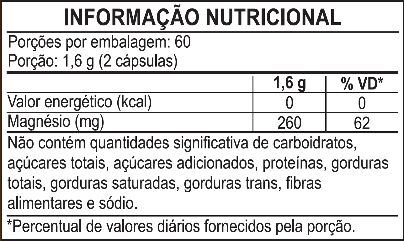 - Este produto não é um medicamento. - Não exceder a recomendação diária de consumo indicada na embalagem. - Mantenha fora do alcance de crianças. - Gestantes e/ou lactantes somente devem consumir este produto sob orientação de nutricionista ou médico. - Manter a embalagem bem fechada e em local seco e fresco. Não expor à luz solar. Consumir em até 60 dias após aberto. NÃO CONTÉM GLÚTEN. | 1. Ecycle. Cloreto de magnésio: o que é e para que serve? Disponível em: <https://www.ecycle.com.br/cloreto-de-magnesio/> 2. Costa, Flávia. Cloreto de magnésio: para que serve e como usar. Disponível em: <https://www.tuasaude.com/cloreto-de-magnesio/> 3. De Oliveira, Ana Paula. 8 benefícios do cloreto de magnésio para a saúde. Disponível em: <https://saude.zelas.com.br/artigos/beneficios-cloreto-de-magnesio> 4. Lapon. Benefícios do magnésio: tudo sobre cloreto de magnésio P.A e magnésio dimalato. Disponível em: <https://lapon.com.br/cloreto-de-magnesio-7-beneficios-para-seu-corpo/> |