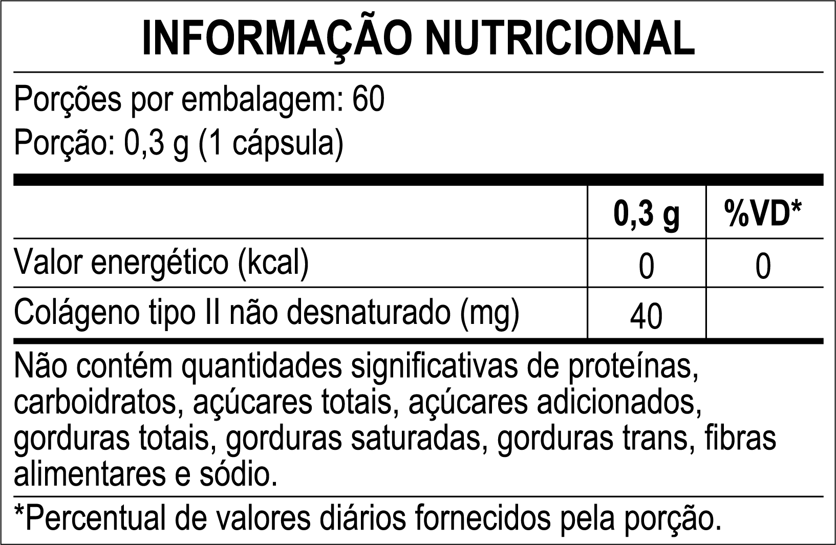 - Este produto não é um medicamento. - Não exceder a recomendação diária de consumo indicada na embalagem. - Mantenha fora do alcance de crianças. - Gestantes e/ou lactantes devem consumir este produto sob orientação de nutricionista ou médico. - Manter a embalagem bem fechada e em local seco e fresco. Não expor à luz solar. Consumir em até 90 dias após aberto. NÃO CONTÉM GLÚTEN. | 1. Kirihara, Ricardo. Colágeno para artrose no quadril: quais os benefícios. Disponível em: <https://www.drricardokirihara.com.br/colageno-para-artrose-no-quadril-quais-os-beneficios> 2. DermaClub. Colágeno tipo 2: o que é, qual diferença e como usar? Disponível em: <https://www.dermaclub.com.br/blog/todos-os-temas/colageno-tipo-2.html> 3. Rachid, Ítalo. Colágeno tipo 1 e tipo 2: qual a diferença? Disponível em: <https://longevidadesaudavel.com.br/colageno-tipo-1-e-tipo-2-qual-a-diferenca/> 4. Testoni, Marcelo. Colágeno para a pele, articulação e ossos: conheça os tipos e como funcionam. Disponível em: <https://www.uol.com.br/vivabem/noticias/redacao/2023/10/30/para-pele-articulacao-conheca-os-tipos-de-colagenos-e-como-funcionam.htm> |