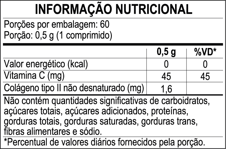 ![]() | ![]() Ingredientes Ácido ascórbico, colágeno de frango com colágeno tipo II não desnaturado, lubrificante talco. Antiumectantes: estearato de magnésio e dióxido de sílico. |