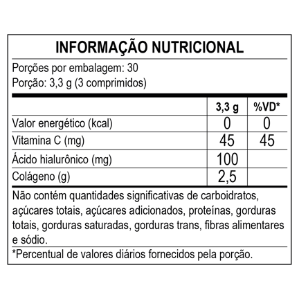 ![]() | ![]() Ingredientes Peptídeos bioativos de colágeno hidrolisado com peso molecular médio de 2kDa, hialuronato de sódio obtido pela fermentação de Streptococcus zoopidemicus, ácido ascórbico, lubrificante talco. Agente de massa: celulose microcristalina. Antiumectantes: estearato de magnésio e dióxido de silício. Cada porção contém 2,5g de Verisol®. Verisol® é uma marca da GELITA, AG. |