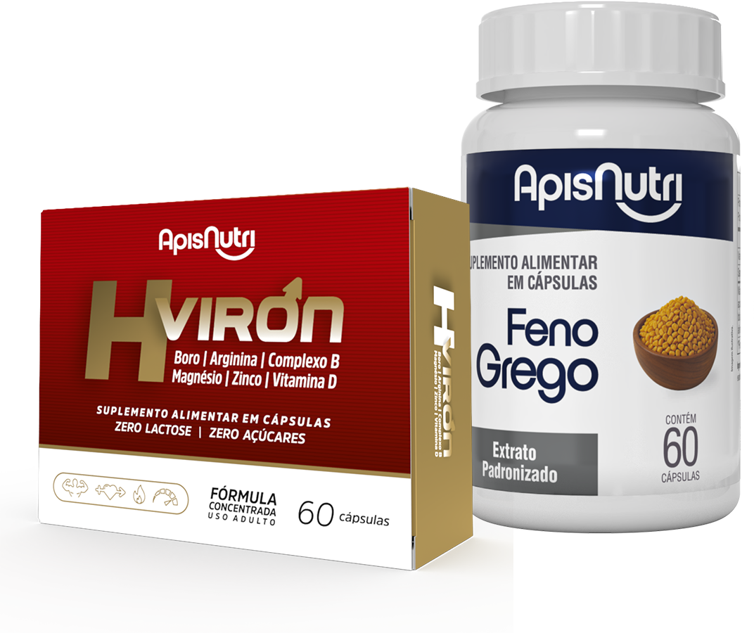 | Desempenho Sexual Masculino A Vitamina D, presente no H-Viron está associada a níveis mais altos de Testosterona e pode desempenhar um papel na melhoria da Função Sexual Masculina. Além disso, a deficiência de Vitamina D tem sido associada a uma série de condições que podem afetar negativamente o desempenho sexual, como baixa libido e disfunção erétil.  | Saúde Hormonal O Feno Grego está relacionado com o estímulo hormonal natural tanto em homens como em mulheres, dessa forma atua sobre a vitalidade e a disposição geral. O Feno Grego da Apisnutri é produzido com extrato padronizado com alto teor de saponinas.  |