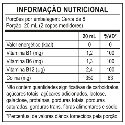 | - Este produto não é um medicamento. - Não exceder a recomendação diária de consumo indicada na embalagem. - Mantenha fora do alcance de crianças. - Não expor à luz do sol, proteger do calor e da umidade antes e depois da abertura da embalagem. Não consuma o produto com o prazo de validade vencido. ZERO AÇÚCARES. ZERO LACTOSE. NÃO CONTÉM GLÚTEN. | 1. Costas, Leonardo. Tiamina: para que serve a vitamina B1, como consumir e sinais de sua falta. Disponível em: <https://www.uol.com.br/vivabem/faq/conheca-a-tiamina-uma-grande-aliada-para-o-bom-funcionamento-do-organismo.htm> 2. CPT. Vitamina B8:importância, fontes de alimentos, valores nutricionais, carência e excesso. Disponível em: <https://www.cpt.com.br/saude/vitamina-b8-importancia-fontes-de-alimentos-valores-nutricionais-carencia-e-excesso> 3. Unimed Fortaleza. Para que serve a vitamina B12?: Conheça 5 benefícios do nutriente. Disponível em: <https://www.unimedfortaleza.com.br/blog/alimentacao/para-que-serve-vitamina-b12> 4. Zanin, Tatiana. Vitamina B6 (piridoxina): para que serve e quantidade recomendada. Disponível em: <https://www.tuasaude.com/funcao-da-vitamina-b6-piridoxina/> |