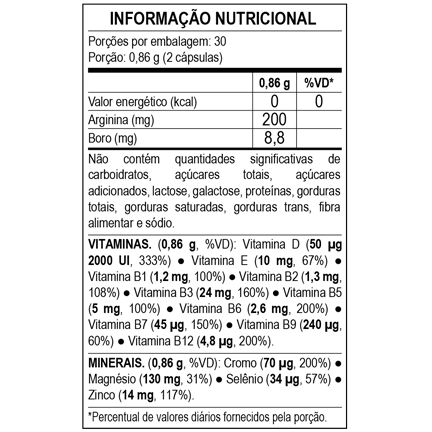 ![]() | ![]() Ingredientes L-arginina, óxido de magnésio, tetraborato de sódio decahidratado, bisglicinato de zinco, nicotinamida, acetato de DL-alfa-tocoferol, D-pantotenato de cálcio, selenometionina, cloridrato de piridoxina, riboflavina, cloridrato de tiamina, picolinato de cromo, ácido fólico, colecalciferol, D-biotina, cianocobalamina. Antiumectante: estearato de magnésio. Cápsula: gelatina e água deionizada. |