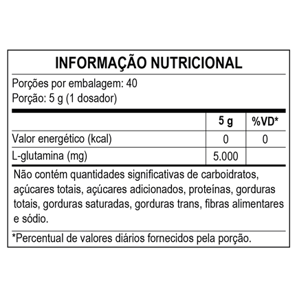 | - Este produto não é um medicamento. - Não exceder a recomendação diária de consumo indicada na embalagem. - Mantenha fora do alcance de crianças. - Este produto não deve ser consumido por gestantes, lactantes e crianças. - Manter a embalagem bem fechada e em local seco e fresco. Não expor à luz solar. Consumir em até 45 dias após aberto. PODE CONTER TRAÇOS DE GLÚTEN. | 1. Cruzat, Vinicius. F; Petry, Éder. R; Tirapegui, Julio. Glutamina: aspectos bioquímicos, metabólicos, moleculares e suplementação. Disponível em: https://www.scielo.br/j/rbme/a/BSkcq7h33h7KZny4jnmY5vb/?format=pdf&lang=pt 2. Melo, Silvia. Para que serve a glutamina e quando tomar? Disponível em: <https://catracalivre.com.br/saude-bem-estar/para-que-serve-a-glutamina-e-quando-tomar/> 3.Schiavon, Fabiana. O que é a glutamina e para que serve? Há benefício para quem se exercita? Disponível em: <https://saude.abril.com.br/fitness/o-que-e-a-glutamina-e-para-que-serve> 4. Zanin, Tatiana. Glutamina: o que é, para que serve, alimentos e como tomar. Disponível em: <https://www.tuasaude.com/como-tomar-glutamina/> |