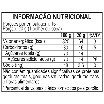 | - ESTE PRODUTO NÃO DEVE SER CONSUMIDO POR CRIANÇAS MENORES DE 01 (UM) ANO DE IDADE. - O Mel pode variar de cor, cheiro e sabor, dependendo das flores que as abelhas coletam o néctar. Todo mel de qualidade cristaliza com o tempo ou em baixa temperatura. Para voltar ao estado líquido, basta colocar em banho-maria a 45ºC. CONTÉM AROMATIZANTES. NÃO CONTÉM GLÚTEN. | 1. Terra. 6 benefícios do mel para a saúde. Disponível em: <https://www.terra.com.br/vida-e-estilo/degusta/alimentacao-com-saude/6-beneficios-do-mel-para-a-saude,9c8aa61dba0b10b668de6738921cad1co88nswfp.html> 2. Unimed Nacional. 7 tipos de mel e seus benefícios. Disponível em: <https://www.centralnacionalunimed.com.br/viver-bem/alimentacao/7-tipos-de-mel-e-seus-beneficios> 3. Fujiwara, Clarissa; Stupiello, Bruna. Mel: 7 benefícios, propriedades e opções para consumir. Disponível em: <https://www.minhavida.com.br/alimentacao/ingredientes/3181-mel> 4. Lopes, Alessandra Castilho; Silva, Alessandra Ribeiro da; Santos, Ana Carolina da Silva; Fagundes, Cássia Odete Tenório; Santana, Fernanda Caroline Galiano. Mel e suas propriedades nutricionais, 2018. Trabalho de Conclusão de Curso (Curso Técnico em Farmácia) – Etec Amim Jundi, Osvaldo Cruz, SP, 2018. |