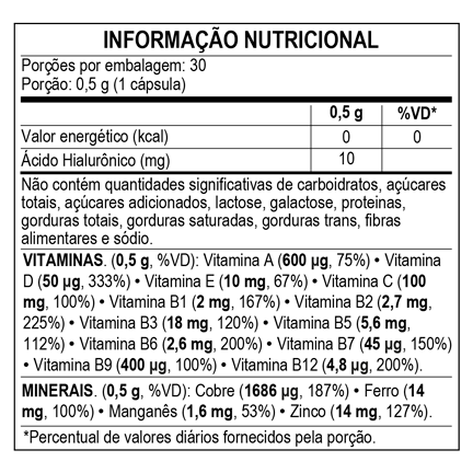| - Este produto não é um medicamento. - Não exceder a recomendação diária de consumo indicada na embalagem. - Mantenha fora do alcance de crianças. - Este produto não deve ser consumido por gestantes, lactantes e crianças. - Manter a embalagem bem fechada e em local seco e fresco. Não expor à luz solar. Consumir em até 60 dias após aberto. ZERO LACTOSE. NÃO CONTÉM GLÚTEN. | 1. CPT. Vitamina B9: sua importância, fontes de alimentos, valores nutricionais, carência e excesso. Disponível em: <https://www.cpt.com.br/saude/vitamina-b9-importancia-fontes-de-alimentos-valores-nutricionais-carencia-e-excesso> 2. Osse, Luciane. Alimentos ricos em ferro: quais são, seus benefícios e onde encontrá-los. Disponível em: <https://www.h9j.com.br/pt/sobre-nos/blog/Alimentos-ricos-ferro> 3. Sanches, Danielle. B7: benefícios da biotina vão além do cabelo e das unhas; aprenda a usar. Disponível em: <https://www.uol.com.br/vivabem/faq/beneficios-da-biotina-vao-alem-dos-cabelos-e-das-unhas-saiba-mais.htm> 4. Viana, Aleksana. Ácido hialurônico: o que é, para que serve (e como usar). Disponível em: <https://www.tuasaude.com/3-formas-de-usar-o-acido-hialuronico-no-combate-as-rugas/> |