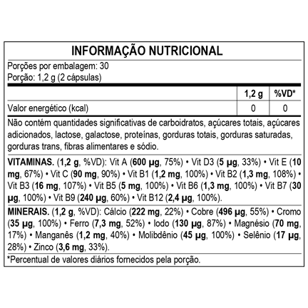 ![]() | ![]() Ingredientes Carbonato de cálcio, bisglicinato de fósforo, vitamina C, bisglicinato de magnésio, vitamina B3, vitamina E, selenometionina, vitamina B5, bisglicinato de potássio, bisglicinato de ferro, bisglicinato de zinco, vitamina B2, vitamina B6, vitamina B1, vitamina A, bisglicinato de manganês, vitamina B9, bisglicinato de cobre, vitamina B7, vitamina D, vitamina B12. Antiumectante: Fosfato tricálcico. Cápsula: Gelatina (gelatina e água deionizada). |