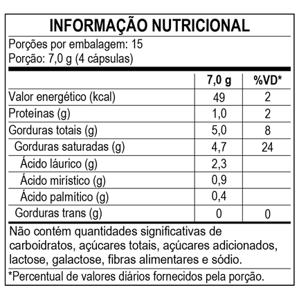 | - Este produto não é um medicamento. - Não exceder a recomendação diária de consumo indicada na embalagem. - Mantenha fora do alcance de crianças. - Este produto não deve ser consumido por gestantes, lactantes e crianças. - Manter a embalagem bem fechada e em local seco e fresco. Não expor à luz solar. Consumir em até 90 dias após aberto. ALÉRGICOS: PODE CONTER DERIVADOS DE SOJA. NÃO CONTÉM GLÚTEN. NÃO CONTÉM LACTOSE. | 1. Cerquetani, Samantha. Óleo de coco faz bem à saúde e emagrece? Calma, os benefícios são outros. Disponível em: <https://www.uol.com.br/vivabem/faq/oleo-de-coco-faz-bem-a-saude-tire-as-principais-duvidas-sobre-o-alimento.htm> 2. DermaClub. Óleo de coco: o que é, para que seve como usar. Disponível em: <https://www.dermaclub.com.br/blog/todos-os-temas/oleo-de-coco.html> 3. Tavares, Laura. 7 benefícios ao consumir óleo de coco. Disponível em: <https://www.minhavida.com.br/materias/materia-9055> 4. Zanin, Tatiana. Óleo de coco em cápsulas: para que serve (e como tomar). Disponível em <https://www.tuasaude.com/oleo-de-coco-em-capsulas/> |