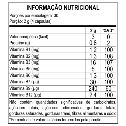 ![]() | ![]() Ingredientes Vitamina B3, Vitamina B5, Vitamina B6, Vitamina B2, Vitamina B1, Vitamina B9, Vitamina B7 e Vitamina 12. Agente de Massa: spirulina. |