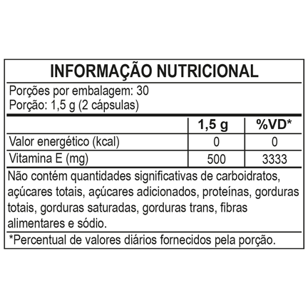 | - Este produto não é um medicamento. - Não exceder a recomendação diária de consumo indicada na embalagem. - Mantenha fora do alcance de crianças. - Gestantes e/ou lactantes somente devem consumir este produto sob orientação de nutricionista ou médico. - Manter a embalagem bem fechada e em local seco e fresco. Não expor à luz solar. Consumir em até 60 dias após aberto. NÃO CONTÉM GLÚTEN. | 1. Bittencourt, Gabriela. 21 alimentos ricos em vitamina E: veja lista. Disponível em: <https://ge.globo.com/eu-atleta/nutricao/noticia/2022/08/04/21-alimentos-ricos-em-vitamina-e-veja-lista-e-quantidades.ghtml> 2. Streab, João. A. Vitamina E: para que serve e onde encontrar o nutriente. Disponível em: <https://saude.abril.com.br/alimentacao/vitamina-e-para-que-serve-onde-encontrar-nutriente-usado-pele#google_vignette> 3. Vettore, Rebecca. Vitamina E: entenda para que serve e quais são os benefícios. Disponível em: <https://www.terra.com.br/vida-e-estilo/saude/vitamina-e-entenda-para-que-serve-e-quais-sao-os-beneficios,3a6838dff3f3f83b91a566a3603e0116hu7scmpi.html> 4. Zanin, Tatiana. Vitamina E: para que serve e quando tomar o suplemento. Disponível em: <https://www.tuasaude.com/vitamina-e/> |
