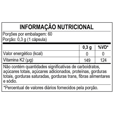| - Este produto não é um medicamento. - Não exceder a recomendação diária de consumo indicada na embalagem. - Mantenha fora do alcance de crianças. - Gestantes e/ou lactantes somente devem consumir este produto sob orientação de nutricionista ou médico. - Manter a embalagem bem fechada e em local seco e fresco. Não expor à luz solar. Consumir em até 60 dias após aberto. NÃO CONTÉM GLÚTEN. | 1. Abreu cardiologia. Vitamina K2: tudo o que você precisa saber. Disponível em: <https://abreucardiologia.com.br/vitamina-k2/> 2. Hospital Azambuja. Vitamina K2: conheça os benefícios da vitamina do momento. Disponível em: <https://www.hospitalazambuja.com.br/conheca-os-beneficios-da-vitamina-k2/> 3. Leal, Karla. Vitamina K2: para que serve, alimentos ricos (e quando tomar). Disponível em: <https://www.tuasaude.com/vitamina-k2/> 4. Navas, Daniel. Vitamina K2: saiba para que serve, onde encontrar e sintomas de deficiência. Disponível em: <https://www.uol.com.br/vivabem/faq/vitamina-k2-saiba-para-que-serve-e-principais-efeitos-colaterais.htm> |
