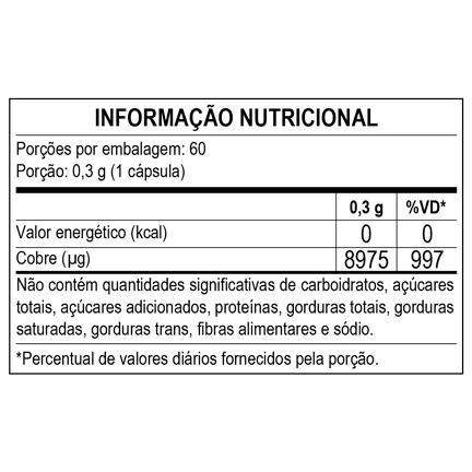 | - Este produto não é um medicamento. - Não exceder a recomendação diária de consumo indicada na embalagem. - Mantenha fora do alcance de crianças. - Gestantes e/ou lactantes somente devem consumir este produto sob orientação de nutricionista ou médico. - Manter a embalagem bem fechada e em local seco e fresco. Não expor à luz solar. Consumir em até 60 dias após aberto. NÃO CONTÉM GLÚTEN. | 1. Pimenta, Angélica. O que é: cobre quelato. Disponível em: <https://angelicapimenta.com.br/glossario/o-que-e-cobre-quelato/> 2. Seabra, Rodrigo. O que é cobre quelato? Dsponível em: <https://drrodrigoseabra.com.br/glossario/o-que-e-cobre-quelato/> 3.Stupiello, Bruna. Cobre é importante para a saúde da pele e do cérebro. Disponível em: <https://www.minhavida.com.br/materias/materia-11644> 4. Zanin, Tatiana. 15 alimentos ricos em cobre (e quantidade recomendada). Disponível em: <https://www.tuasaude.com/alimentos-ricos-em-cobre/> |